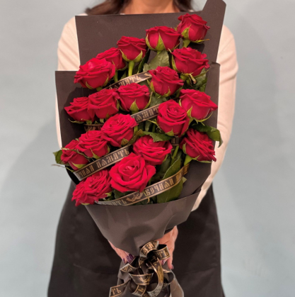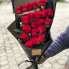 Похоронный букет из красных роз, выложенных симметрично. Добавлена траурная лента.
