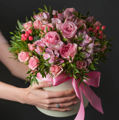 Букет в коробке из кустовых роз и альстромерии | Купить в Ногинске