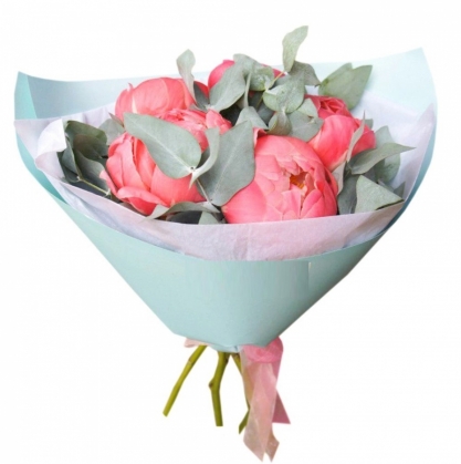 Букет из 5 кораловых пионов с добавлением веточек эвкалипта Бэби-блу. Букет упакован в очень красивую матовую бумагу бирюзового цвета.