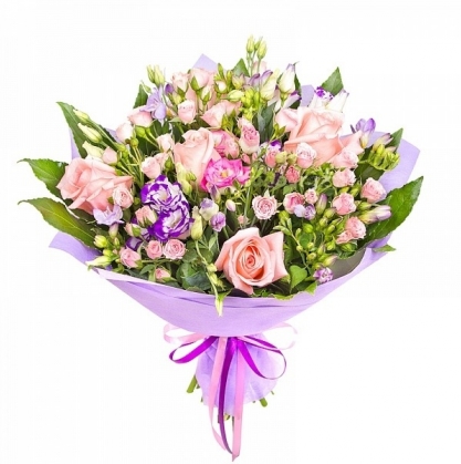 Гармоничная композиция из розовых кустовых и одиночных роз, фрезии и веточек эутомы, с добавлением зелени (фатсия) в упаковке.