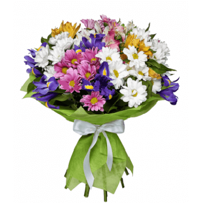 Букет из хризантем, альстромерий и ирисов в натуральной упаковке