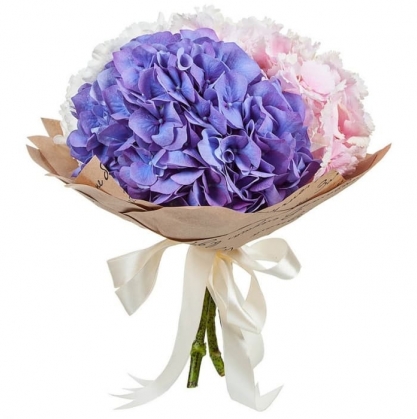 Синие, розовые и белые гортензии в упаковке.