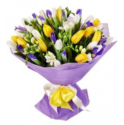 Букет "Три желания" из тюльпанов, ирисов и фрезии | Купить в Ногинске